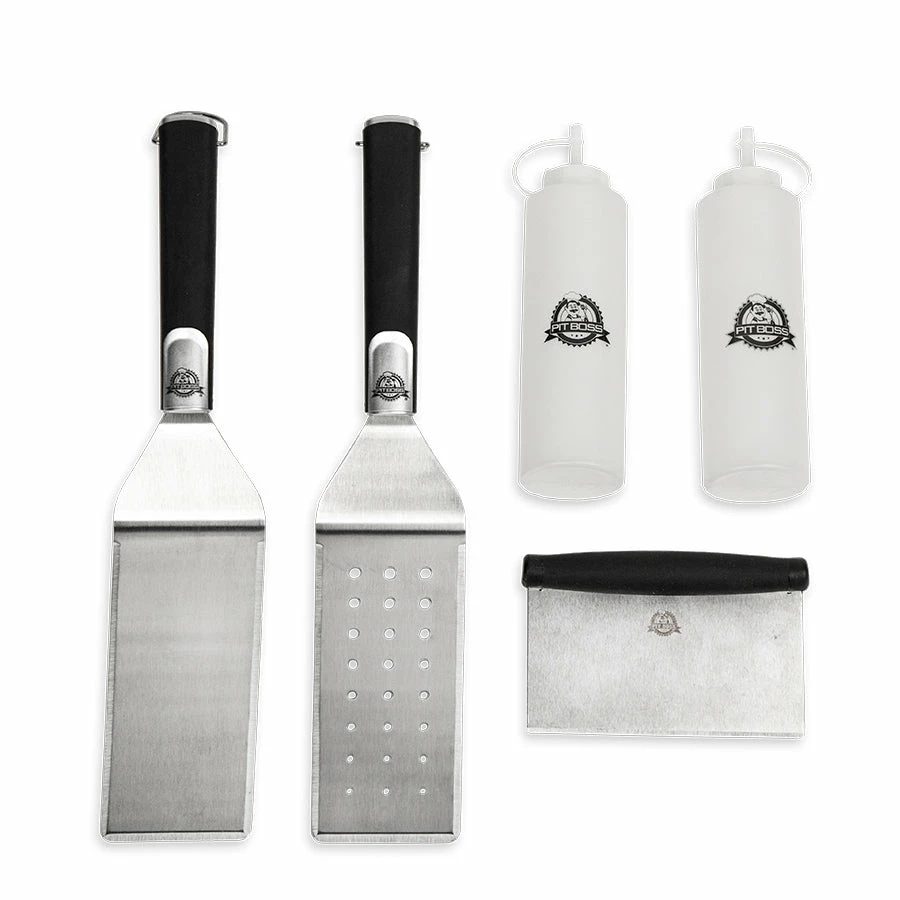 This set has everything you need, all in one package. Flip and lift burgers, pancakes, or scrambled eggs using the perforated or standard turner spatula. The restaurant-quality griddle scraper can quickly chop steak and veggies for fajitas or scape your griddle clean of grease and debris as you go. At the same time, use the fine-tip plastic bottles to quickly and easily add extra sauce, oil, or water. Get the kit that has it all with the Pit Boss 5-Piece Griddle Kit.