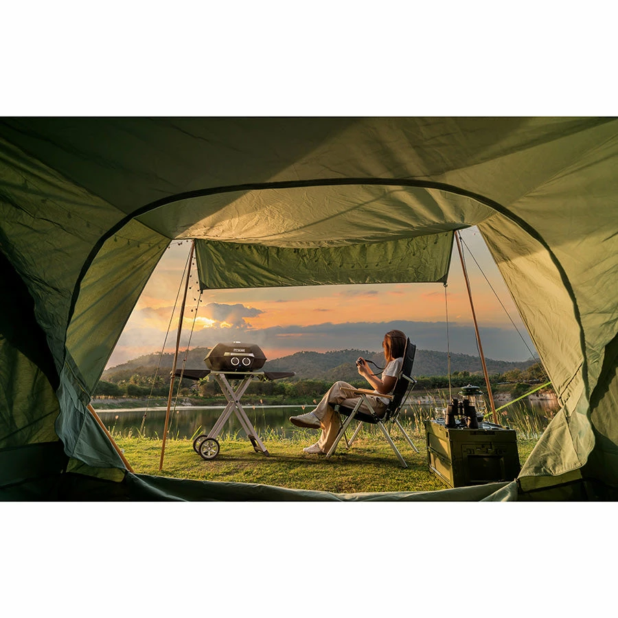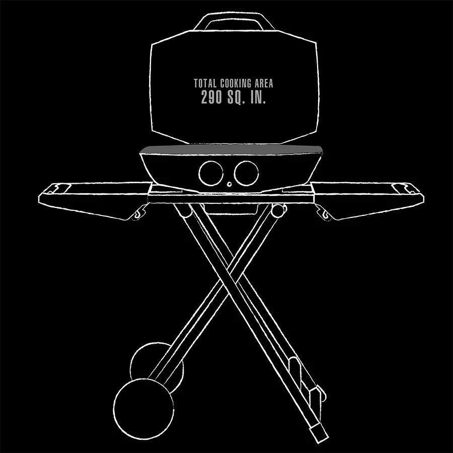 Additional features include 2 in-line style wheels, cast aluminum folding legs, and a high temperature black sand finish, all backed by our best-in-class 2-year warranty.