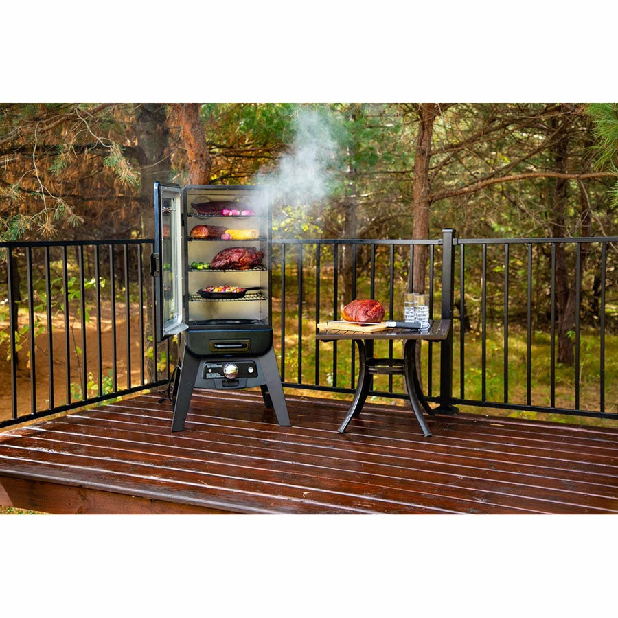 At Pit Boss® Grills, we have engineered a smoker that smokes out the competition. With the Pit Boss Analog Electric Smoker, you can reach temperatures as low as 100°F and as high as 325°F thanks to the double walled cabinet and 1,650 watts of power. With built in controls that are simple to use, you’ll have your unit up and smoking in no time. The ability to infuse flavor into your smoker is easy with the oversized front load wood chip tray, offering up to two hours of cooking time per load. The large viewing window eliminates the need for peek-a-boo cooking and its elevated frame makes transferring your meal from the smoker to the table a breeze.