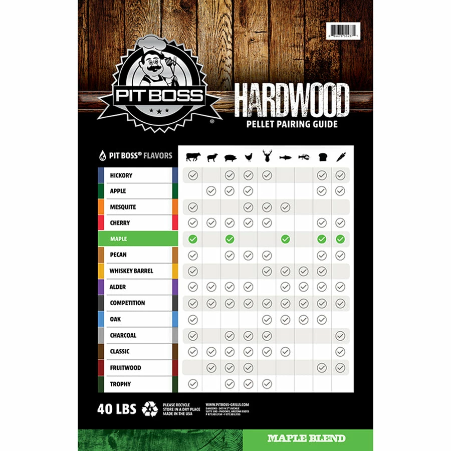 Get a taste of the sweet life with Pit Boss® Maple Blend Hardwood Pellets. This mild blend is a great choice for adding wood-fired flavor to whatever is on your menu. Simply fuel up with Pit Boss Maple Blend Hardwood Pellets for the ultimate flavor upgrade while grilling shrimp or chicken, baking a cobbler, and more. The fact that Pit Boss pellets are 100% natural just sweetens the deal, since they’re always free of artificial flavors, spray scents, glues, and chemicals. Â